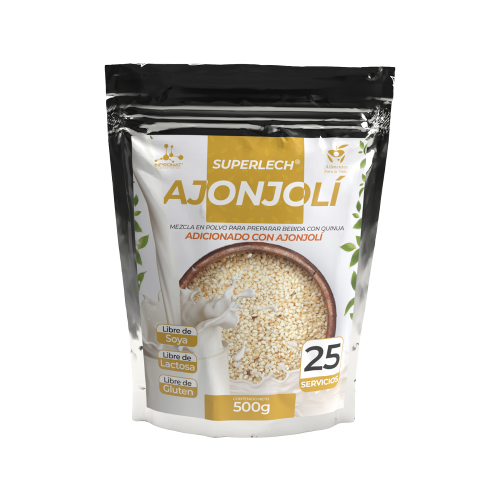 Mezcla en polvo para preparar bebida con quinoa y ajonjolí, libre de soya, lactosa y gluten. Una opción nutritiva que combina proteína vegetal y minerales esenciales para apoyar la digestión y el bienestar general.